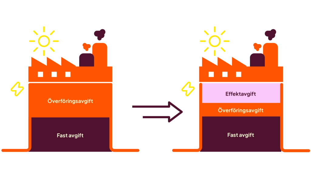 För de flesta av våra företagskunder hade elnätsavgiften tidigare två delar. Nu består den av tre: fast avgift, överföringsavgift och effektavgift. Effektavgiften kan ni påverka genom hur och när ni använder el. Precis som tidigare kan ni fortfarande minska överföringsavgiften genom att använda mindre el.
